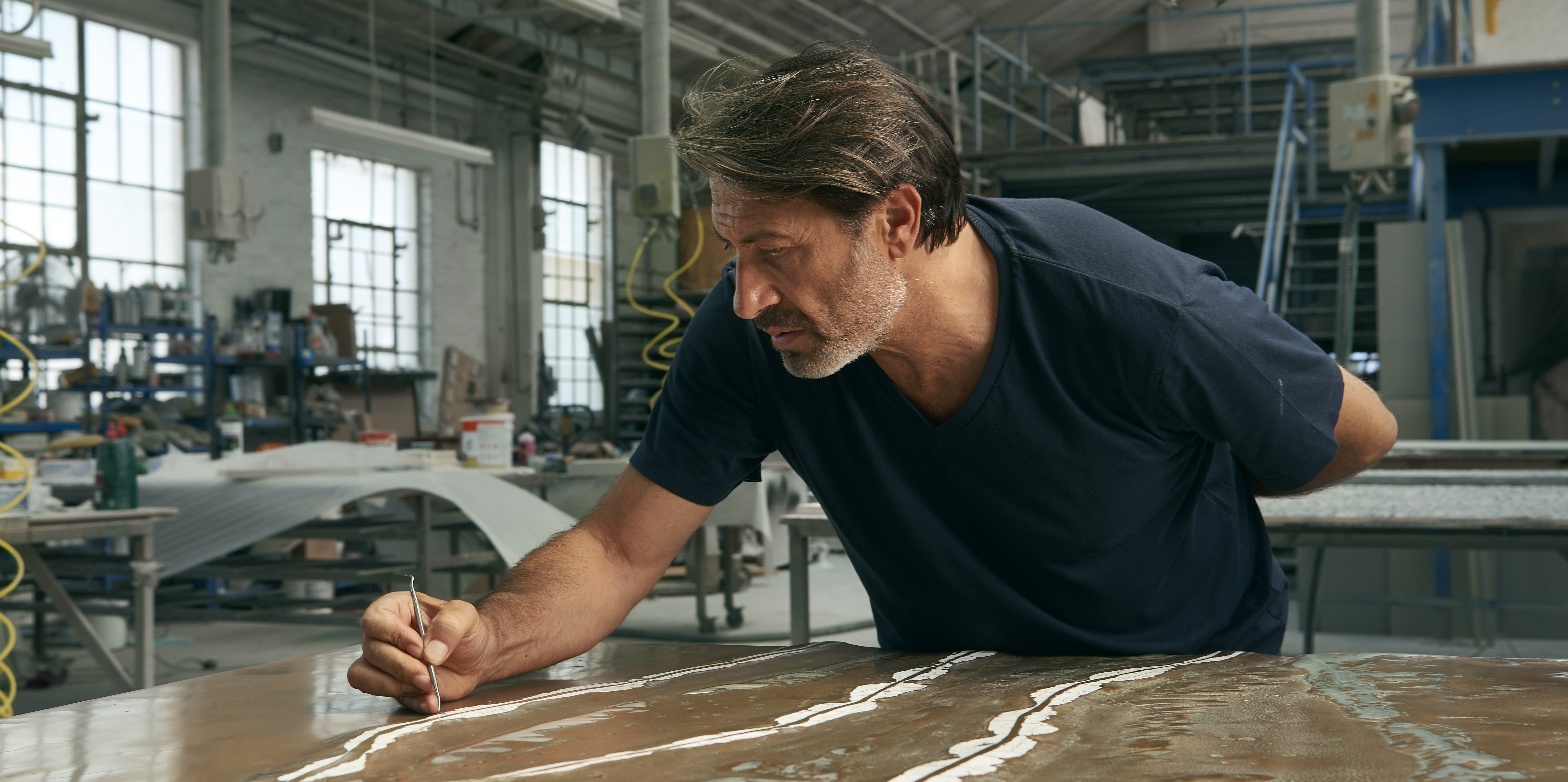 Our workshop houses a team of craftsmen whose expertise is bringing surfaces to life by uniquely mixing and working with both organic and synthetic materials.