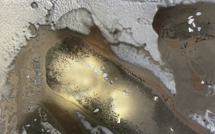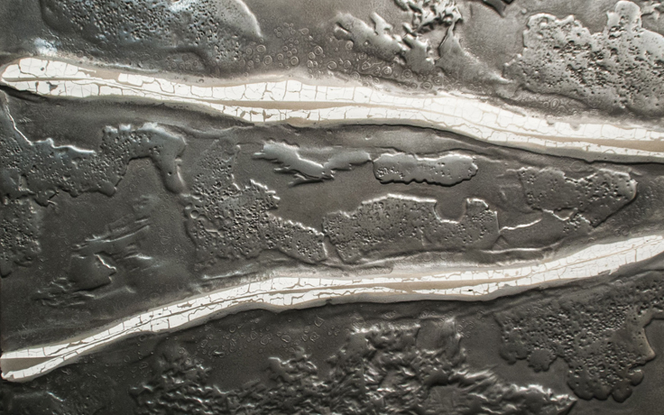 The main elements of this artwork are white ground limestone merged with bronze and silver metals.